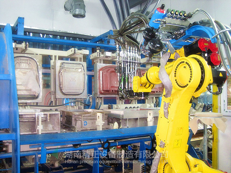 汽车座椅环形发泡线干部为水平地面环形结构布置,可满足各种不同车型的座垫及靠背的发泡,多种产品可在线上混线生产。该生产线采用带刹车的减速电机通过变速箱带动线体整体运动,线体运行速度变频可调,方便调整生产节拍。生产线上模具加热用模温机和模架控制箱均布放置于载模小车上,动力电采用环形电刷(滑环)引入,气源采用集中供气,通过旋转接头引入到线体上每个模架。为方便换模及维修,工位之间的温控水、电缆与压缩空气生产线全部采用快插连接实现快速换模。