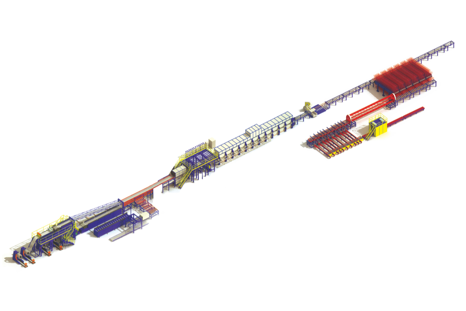 我公司开发的聚氨酯PU夹芯板材连续生产线主要设备有开卷系统、钢板引料系统、钢板自动对接系统、压筋机组、成型机系统、钢板与聚氨酯高强度粘合系统、电晕系统、钢板预热、双履带机及加热系统、岩棉自动分切及输送系统、正戊烷发泡系统、切割锯,带锯一套,盘踞一套(满足软、硬两种饰面切割需求,并且满足软饰面修边功能)、覆膜设备、凉板设备、自动码垛机(考虑软、硬两种不同产品的下板码垛需求)、包装系统、甲类丙类化工料储存系统,输送系统,除尘及环保设备(满足烟台地区的非甲烷总烃的排放含量)、罐区及安全系统等。